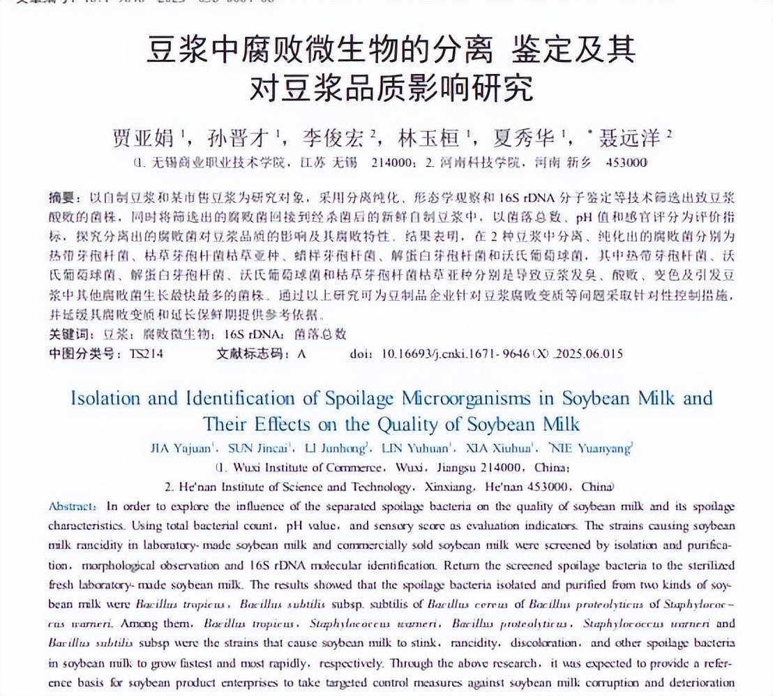 参考资料:豆浆中腐败微生物的分离 鉴定及其 对豆浆品质影响研究 贾亚娟 ,孙晋才 ,李俊宏 ,林玉桓 ,夏秀华 ,聂远洋 农产品加工 2025-03-30